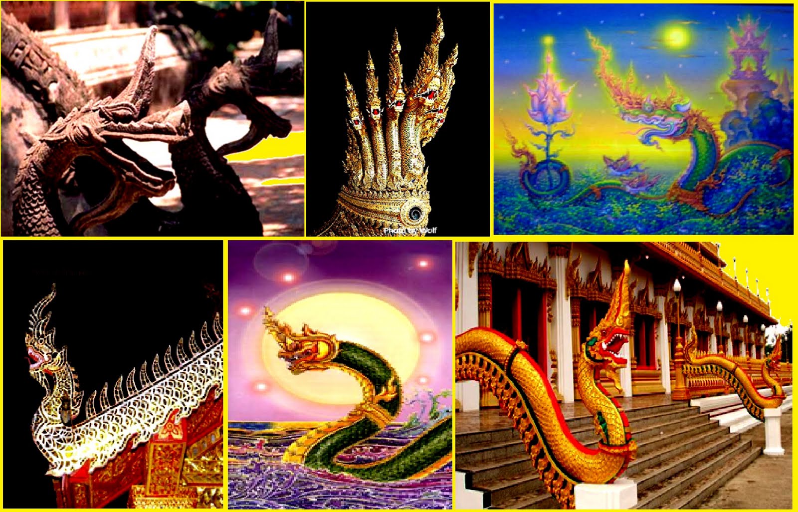 In the Thai Buddhist tradition, Nagas are water spirits, guardians of treasures vast and mysterious. They are most often depicted in the form of huge serpents have sometimes five or seven heads. The Thais believe that even today one can find Nagas in the depths of the Mekhong.